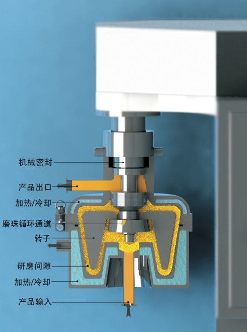 锥形转子球磨机应用于分散性和高粘度产品的精细碾磨。卓越的设计结合了纳米技术应用获得了优异的成果。工程的成功归功于公司多年的经验知识和科学的研发。此研磨机在通用性、工作效率及成本精简上,能满足绝大多数产品的质量要求产品物料经过外部的容积泵输送到研磨室。研磨的作用由锥形腔体之间的间隙,也就是定子和转子之间的间隙产生。这个间隙的范围在6-20毫米之间,还通过转子升降调节间隙大小,间隙大小还与所选的设备型号有关。转子的运动使得研磨介质(金属,玻璃或陶瓷珠子)放射状运动。动能逐渐放大并向外运动因此产品所受的剪切力在研磨期间稳定增加。研磨珠子和产品最终通过出口处的过滤筛分离,仅有研磨均匀的产品被排放出去。最后研磨珠通过通道和进料处的产品混合输送到研磨区,这样完成了一个连续的生产过程最终产品的研磨结果由转子的旋转速度,腔体的间隙距离和磨珠的直径,以及珠子的数量和流体的速度决定。锥形转子间隙球磨机技术确定了生产品质的可重复性,高质量成品和稳定的产品粒径锥形转子间隙球磨机能产生比传统搅拌球磨机多四倍的能量,产品颗粒直径非常均匀,而产生的热能非常的低。